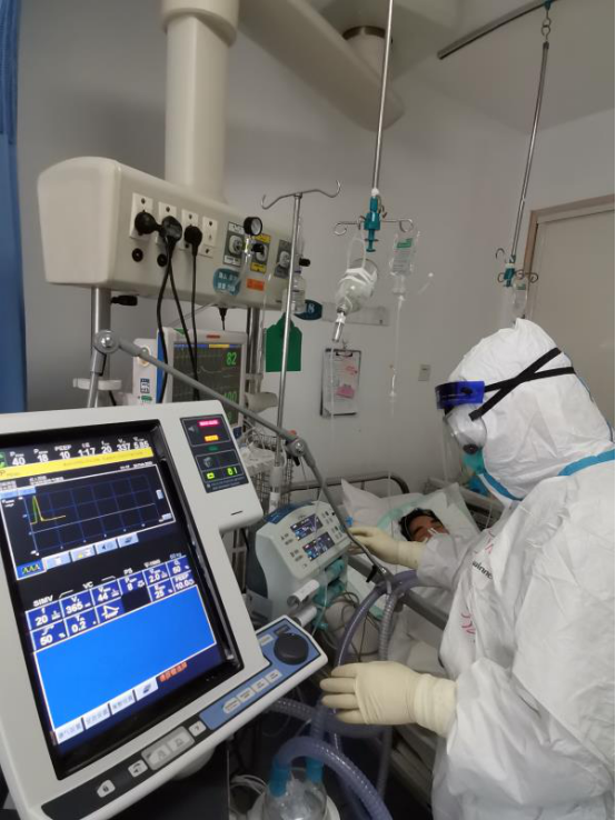 上崗第一天,我們收了第一個新冠肺炎患者,這個病人在高流量吸氧高參數下仍喘累明顯,且二氧化碳分壓70左右,氧合指數小于150,有氣管插管指征。“馬上行氣管插管!”“用有創呼吸機輔助通氣!”“同時采取鎮靜鎮痛措施”……我瞬間進入工作狀態,忘記了恐懼和壓力,眼里只剩下救人!待全部流程處理完畢,病人逐漸平穩下來,一看時鐘,早已過了下班時間。 第二天輪到我上夜班。白班醫師告訴我,病房里有幾個危重病人,有一個行CRRT治療的,兩個氣管插管有創機械通氣的,其中一個在做俯臥位通氣。查看病情、開醫囑、寫交班記錄……在原本醫院早已習慣的工作流程,放到這里,工作強度和壓力都增加了好幾倍,這個夜班,我一直干到了第二天凌晨。